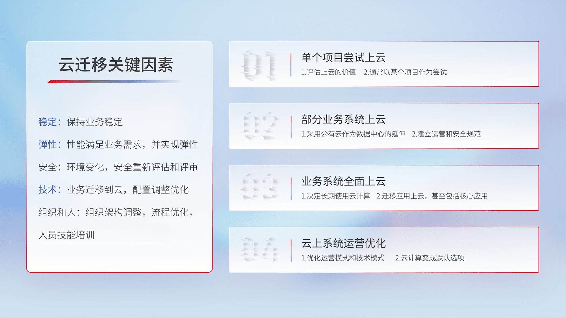 结合实际业务,,,从规划设计、、、云平台选型、、云原生改造、、、数据迁移、、、集成交付,,迁移全过程为客户识别最佳上云路径,,,做好风险识别管理,,,,设计网络架构、、、、身份权限、、、安全审计合规、、、、操作审计、、、日志审计、、、、监控告警策略、、、、多站点容灾设计等,,,,对云上基础设施进行整体规划,,提升IT治理水平,,以满足弹性、、、、高可用、、、、高性能的需求。。。。