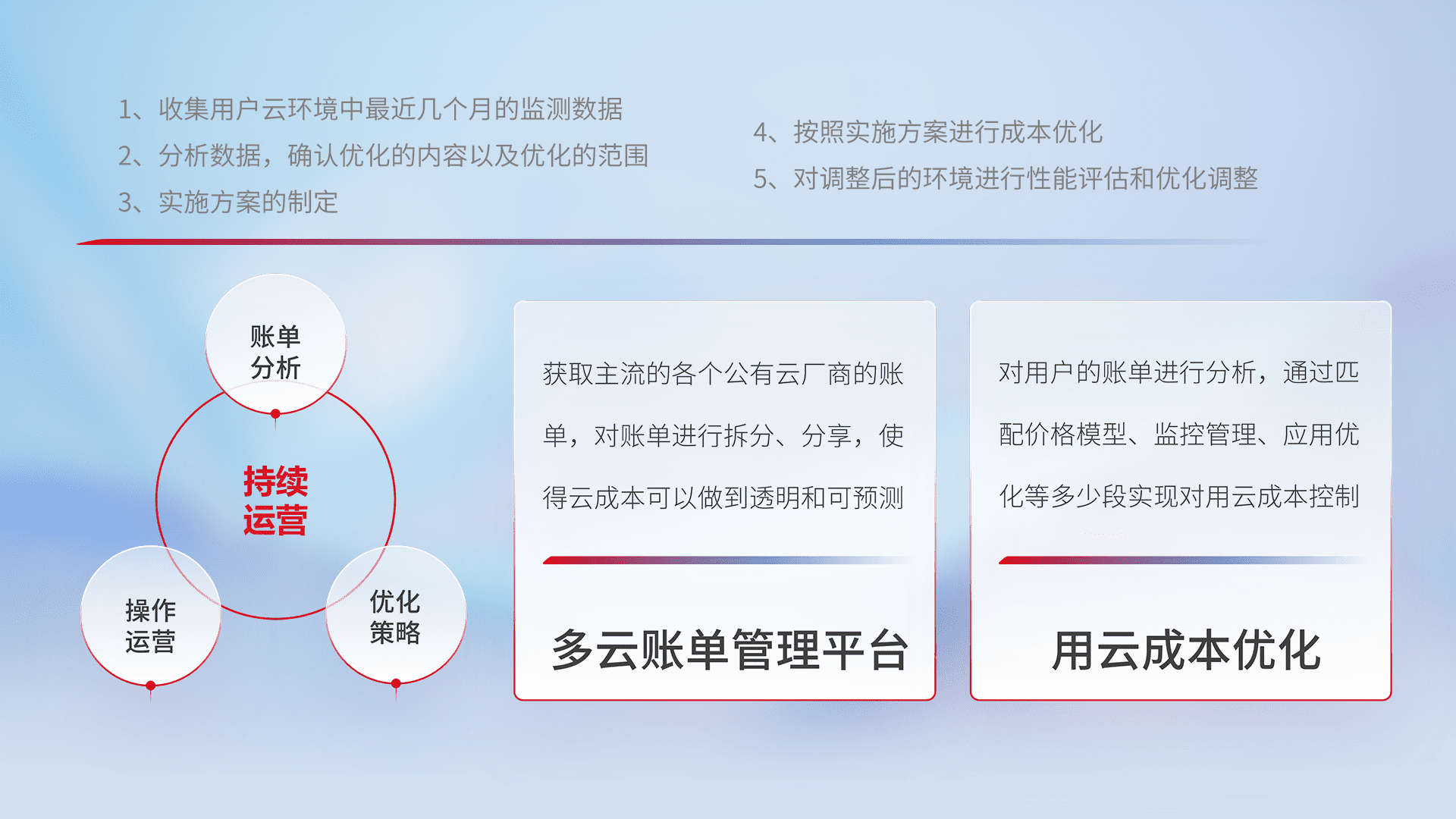 通过多云纳管,,以统一的资源数据模型把客户的云资源进行抽象和封装,,,,进而实现对多云资源的统一操作,,,保障云资源管理的可靠性、、、稳定性与可用性。。。。量身定制化运维内容,,,,配置、、、开发运维、、、补丁管理、、备份、、、、监控、、、认证和访问管理、、、审计和日常巡检等,,保障在用云过程中的可靠度,,,,稳定度以及高可用率。。。。