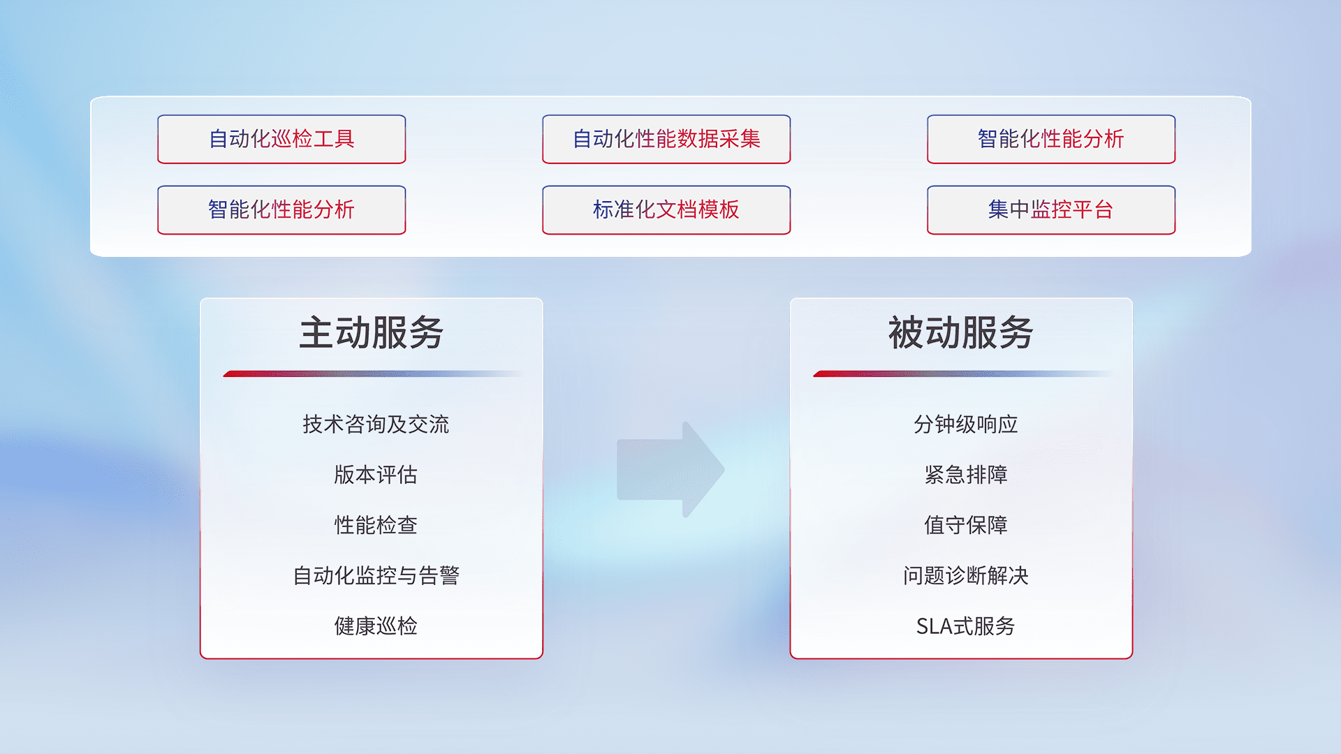 智能化工具和标准化文档,,,保障服务质量,,,,提供主动服务(包含技术咨询、、版本评估、、、性能检查、、、自动化监控与告警、、、、健康巡检)和被动服务包含(分钟级响应、、、紧急排障、、、、值守保障、、、问题诊断解决、、、SLA服务)。。