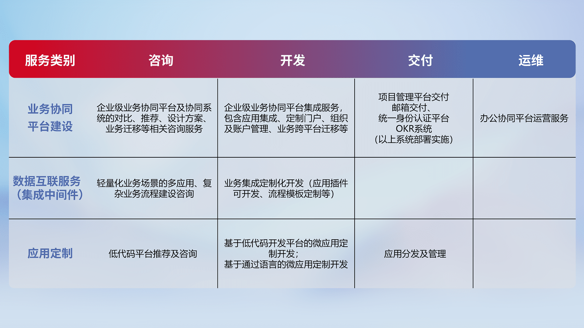 针对钉钉、、、企微、、IDaas等平台级产品提供产品的规划、、、方案、、、交付、、、定制化开发等服务,,,,实现如统一协同办公、、、、智能客户服务、、、混合会议管理、、、智能数据查询、、、、等业务场景,,,实现数字化转型。。